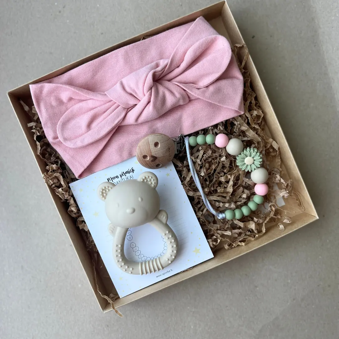 Didžiausias šio rinkinio privalumas – silikoninis barškutis kramtukas meškiuko formos 🧸 Tai ne tik kramtukas, bet ir žaislas. Kūdikis gali jį kramtyti dygstant dantukams, o judinant jis skleidžia švelnų garsą – barška, todėl skatina susidomėjimą ir lavina klausą.