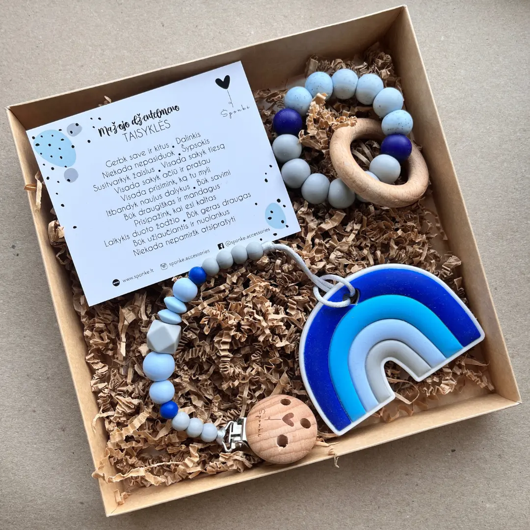 Dovanų rinkinukas kūdikiui – kramtukas ir čiulptuko laikiklis vaivorykštė