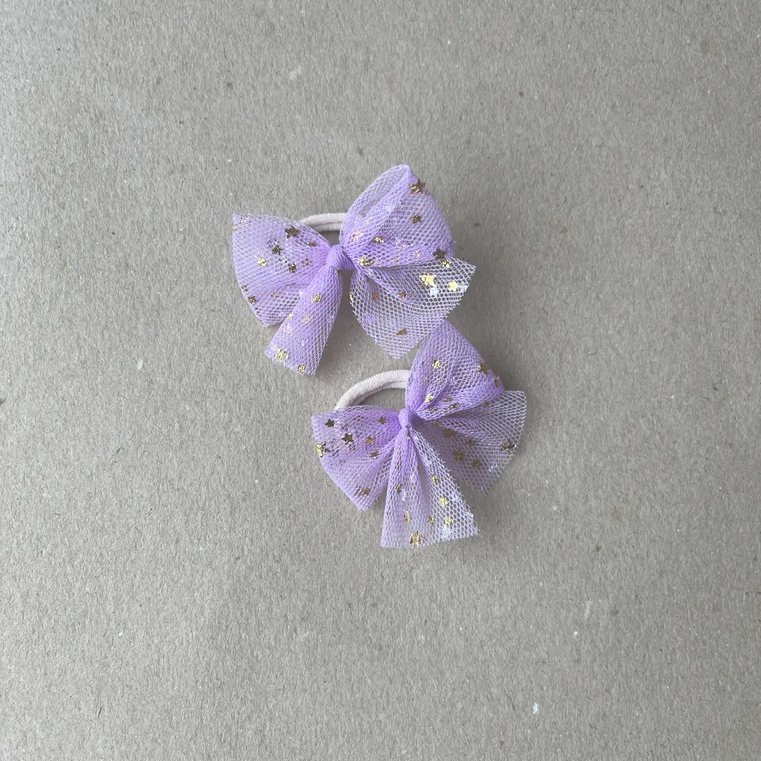 Rinkinį sudaro 2 mini plaukų gumytės mergaitėms, dekoruotos gražiais violetinės spalvos tiulio bantukais su auksinėmis žvaigždutėmis. Lengvas tiulio audinys suteikia aksesuarui elegancijos ir švelnumo, todėl tokios gumytės puikiai papildo įvairias šukuosenas.