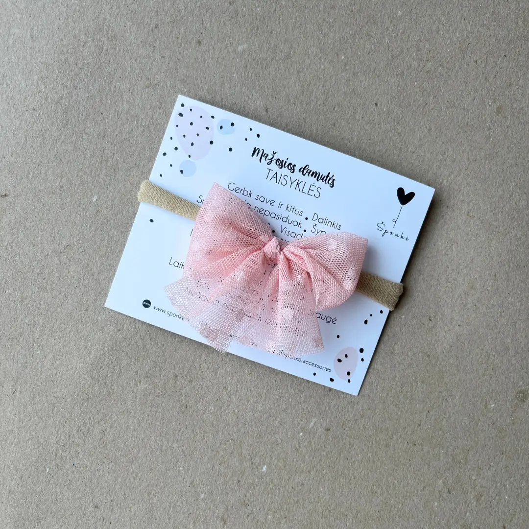 Šią juostelę puošia persikinės spalvos tiulio bantukas su mažais taškučiais, kuris suteikia aksesuarui švelnumo ir elegancijos. Subtili spalva labai gražiai atrodo ant kūdikio galvytės ir puikiai dera prie įvairios aprangos.