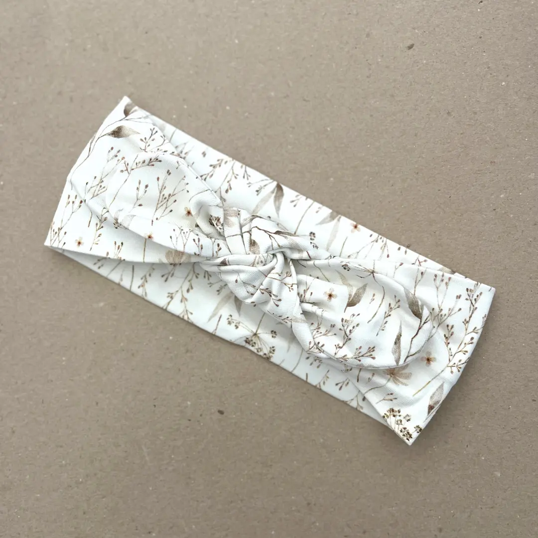 Švelni plati galvos juosta mergaitei su smilgų pievos raštu – elegantiškas ir natūralus aksesuaras mažosioms. Lengvas augalinis raštas suteikia subtilumo ir puikiai dera prie įvairių aprangos derinių.