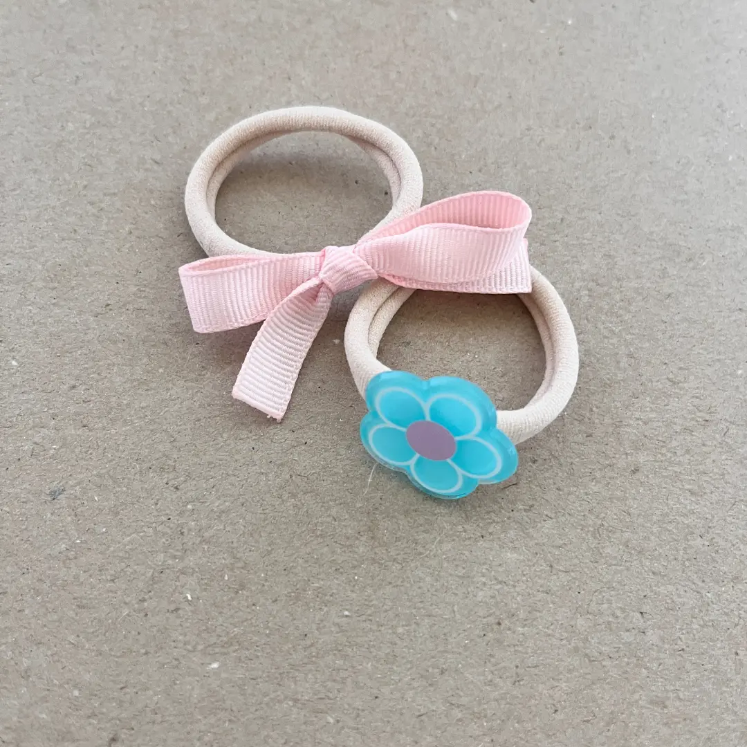 Šis dviejų plaukų gumyčių rinkinukas – švelnaus, minkšto nailono gumytės pagrindo, todėl puikiai tinka tiek plonesniems, tiek storesniems plaukams. Rinkinyje rasite dvi skirtingas gumytes: žydrą gėlytę ir klasikinį rožinį kaspinėlį, kurie subtiliai dera tarpusavyje ir suteikia žaismingo mergaitiško žavesio.