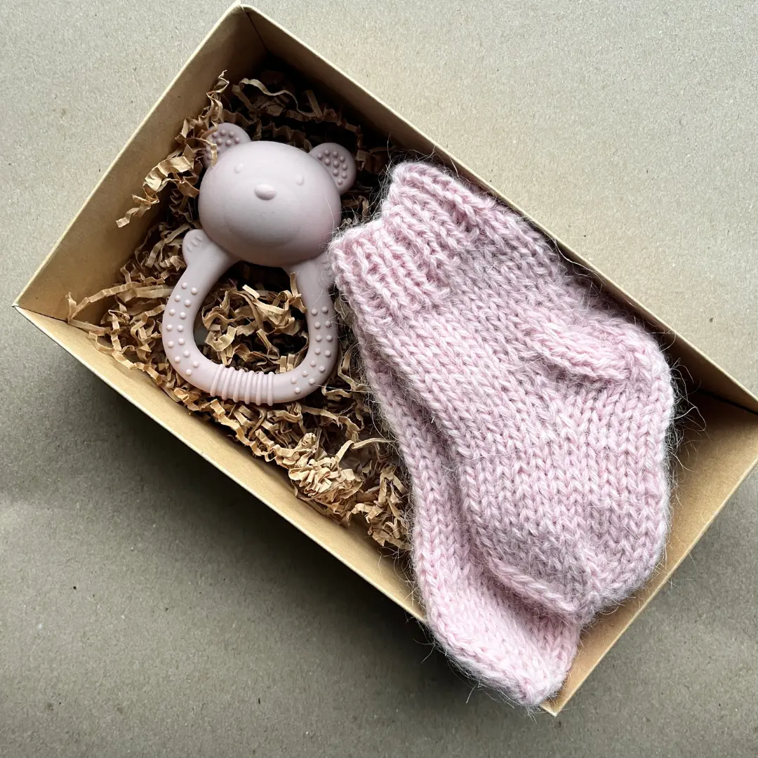 Rinkinys kūdikiui: kramtukas–barškutis ir vilnonės kojinytės