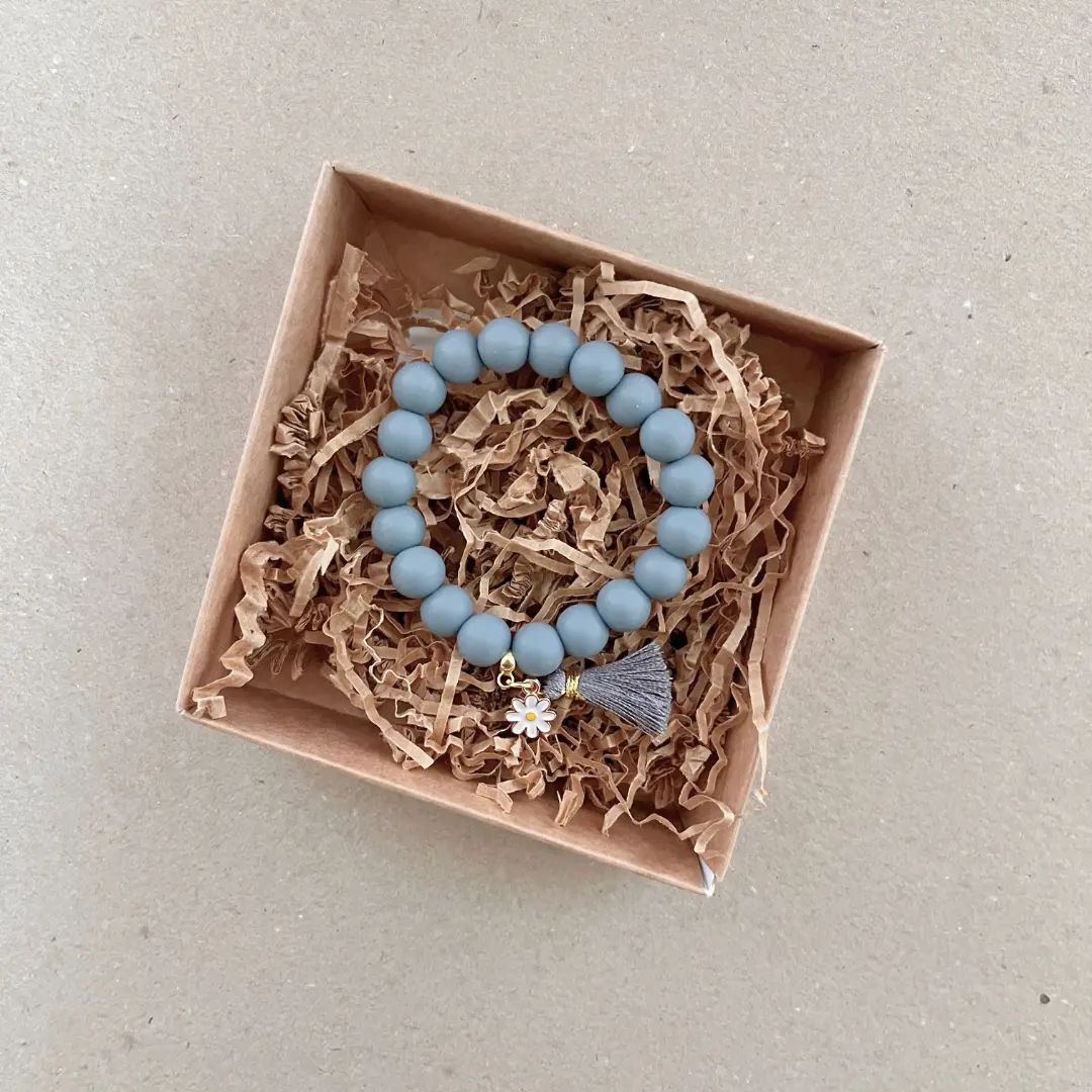 Būkite pirmas aprašęs “Silikoninių karoliukų apyrankė mergaitei su gėlyte – tamsiai pilka”